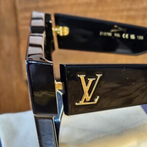 These bold sunglasses feature an exaggerated frame with angular lines and a deep beveled front. They feature dark grey lenses, gold-tone hardware, and 4 Swarovski crystals on the front.