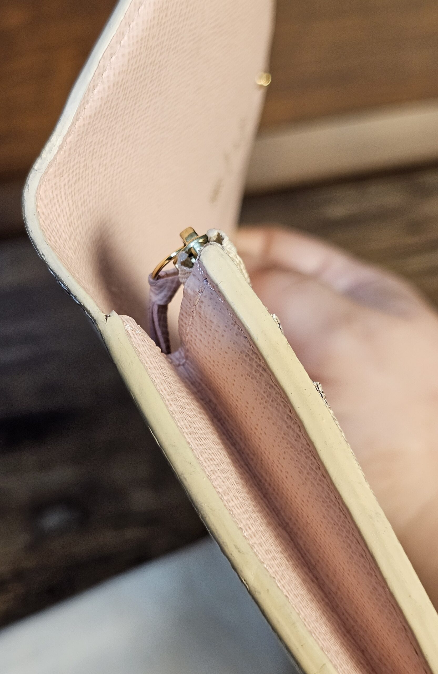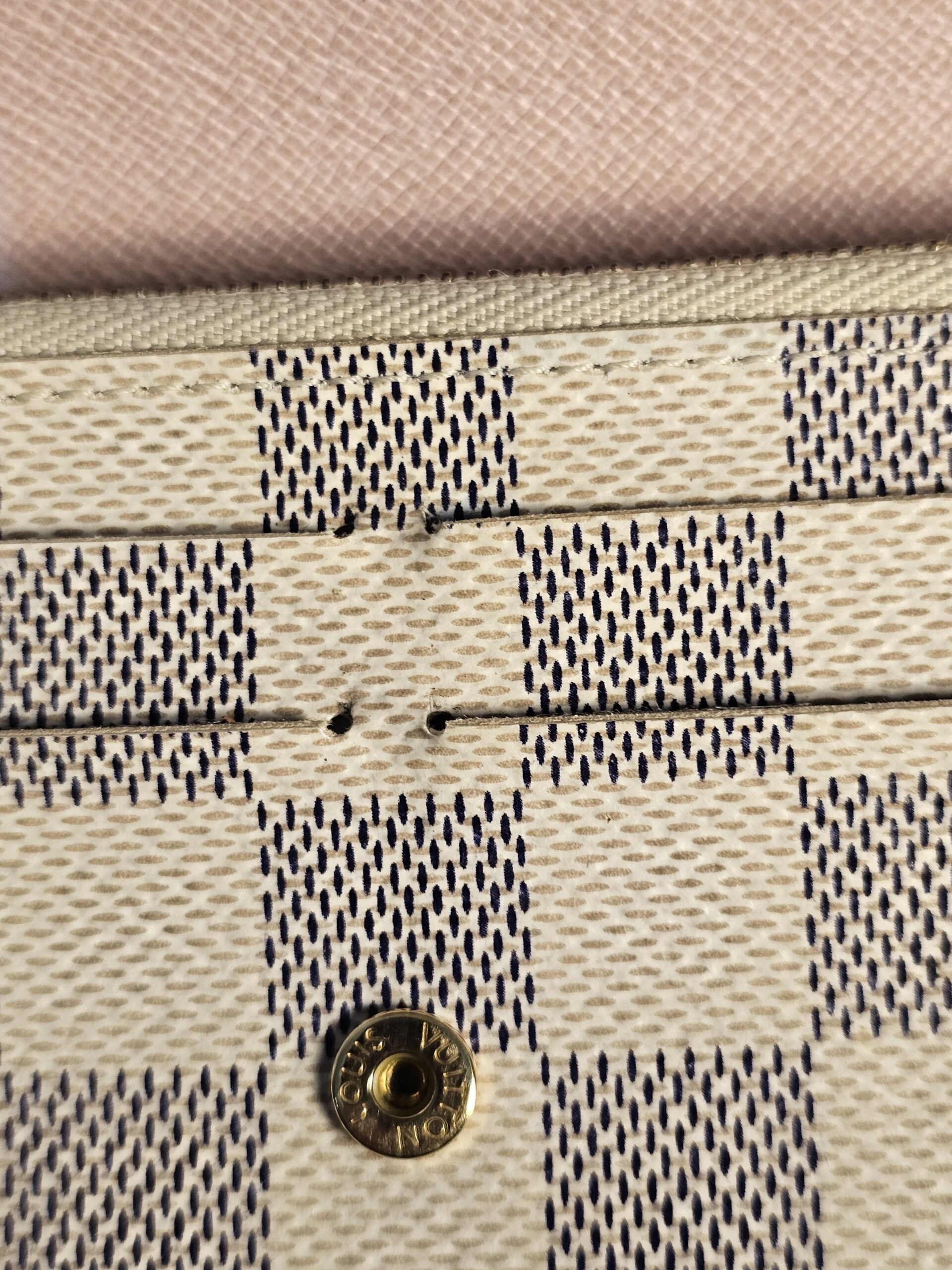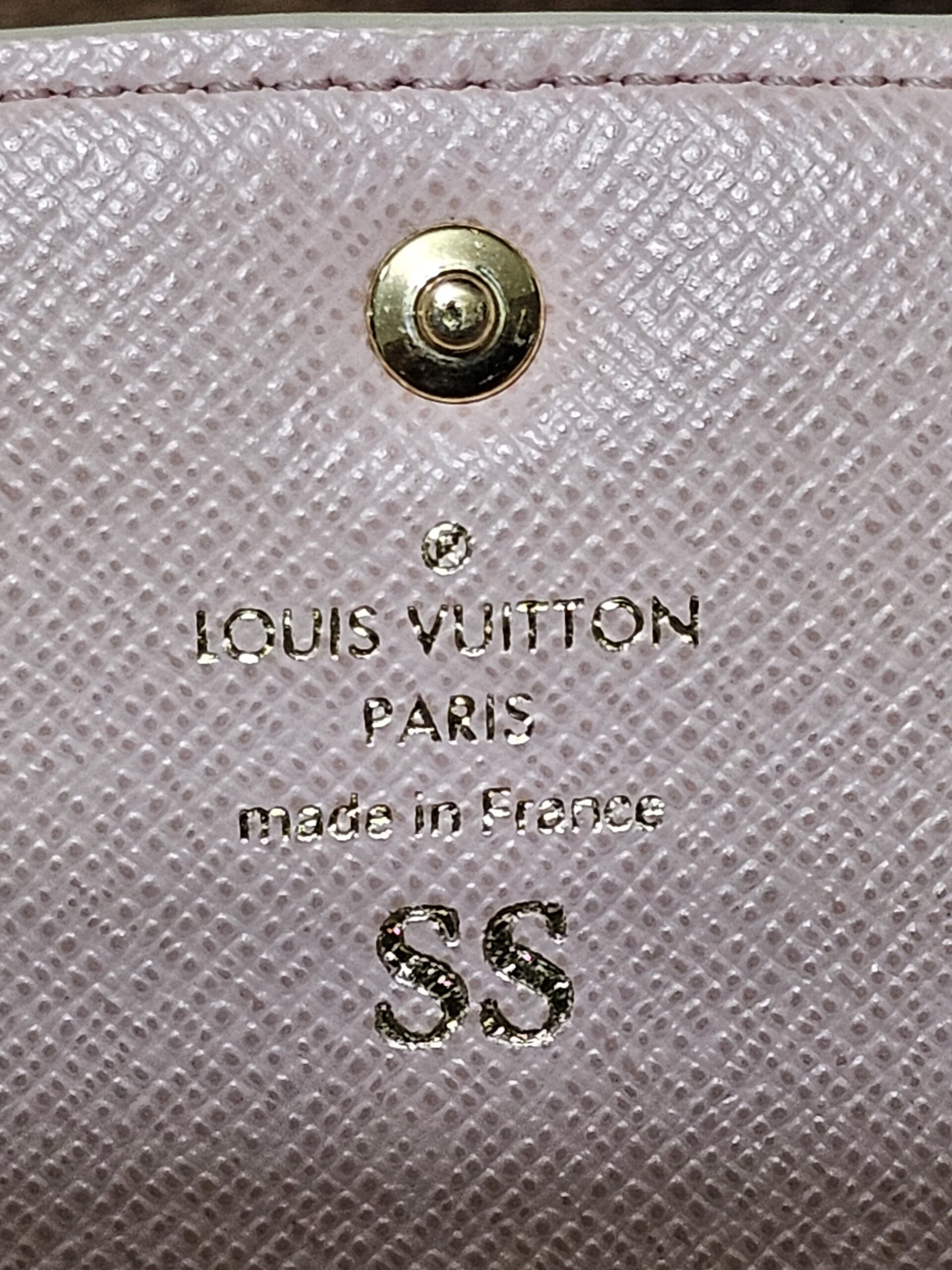 Gold colored hardware button shows some wear