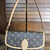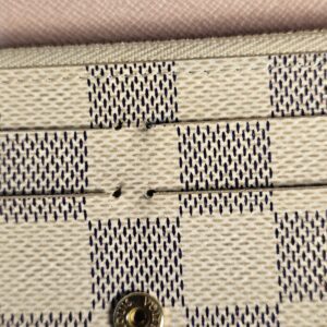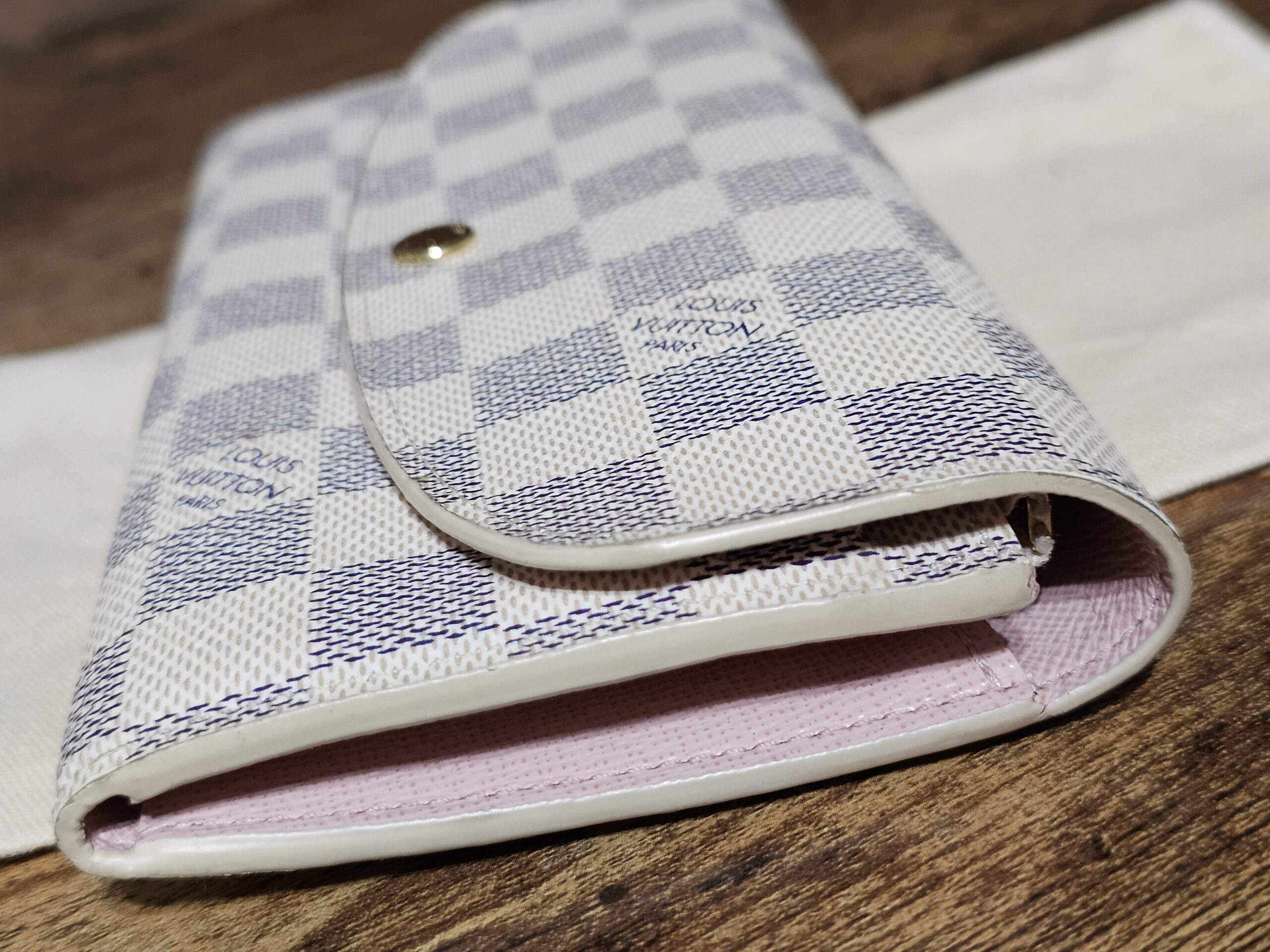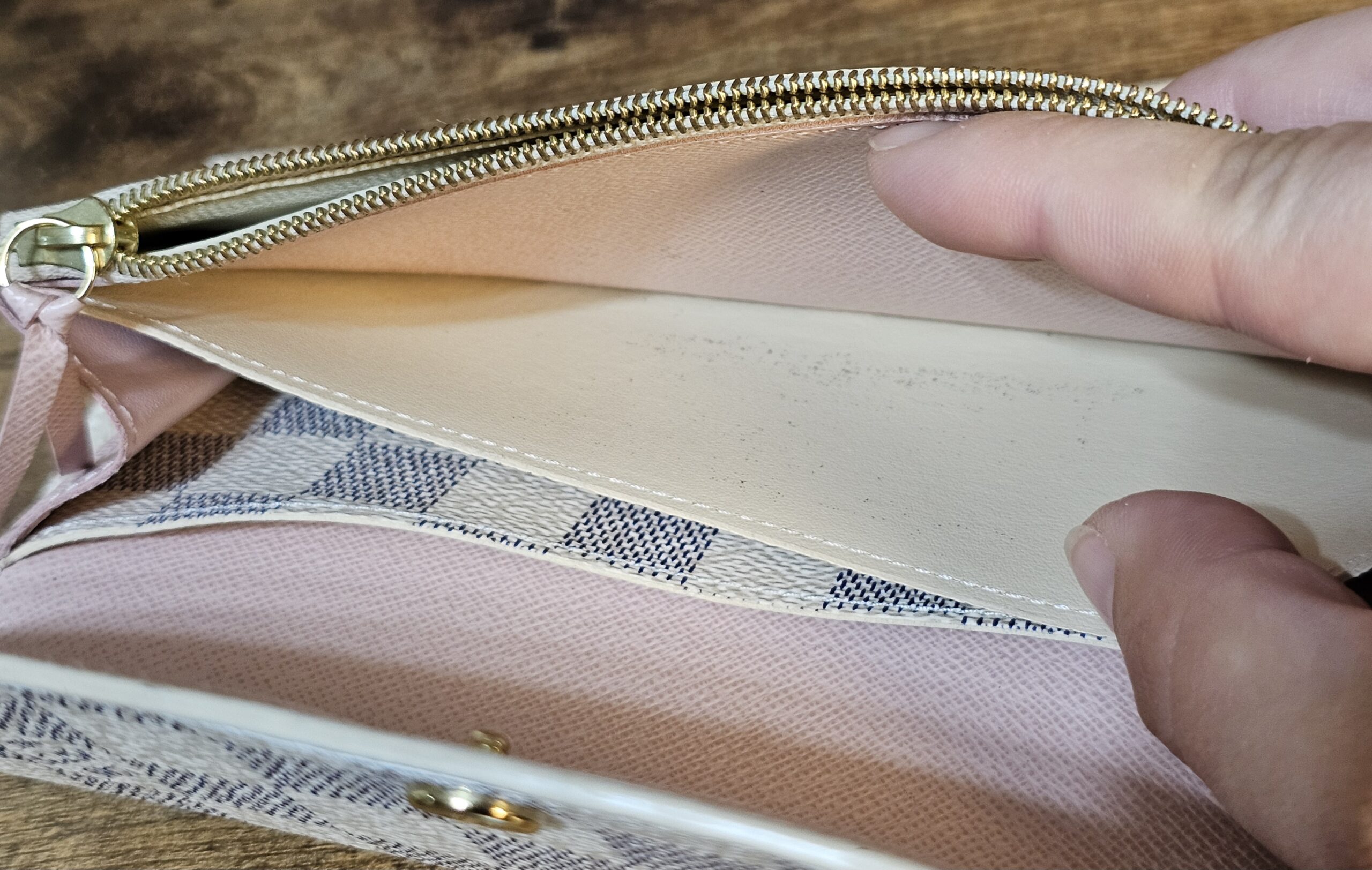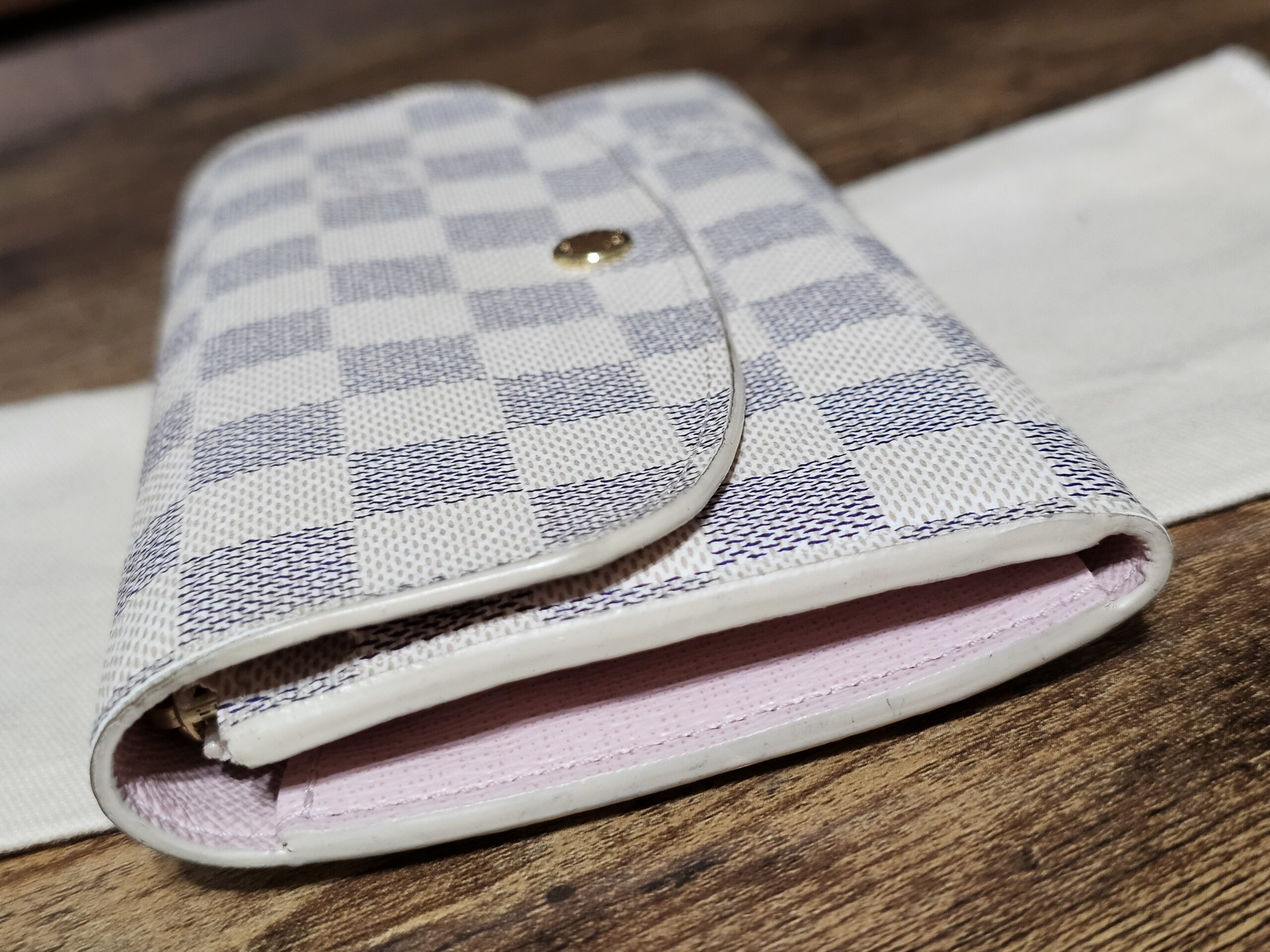 Gold colored hardware button shows some wear