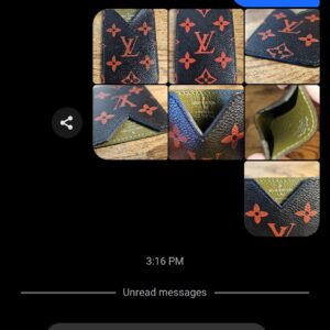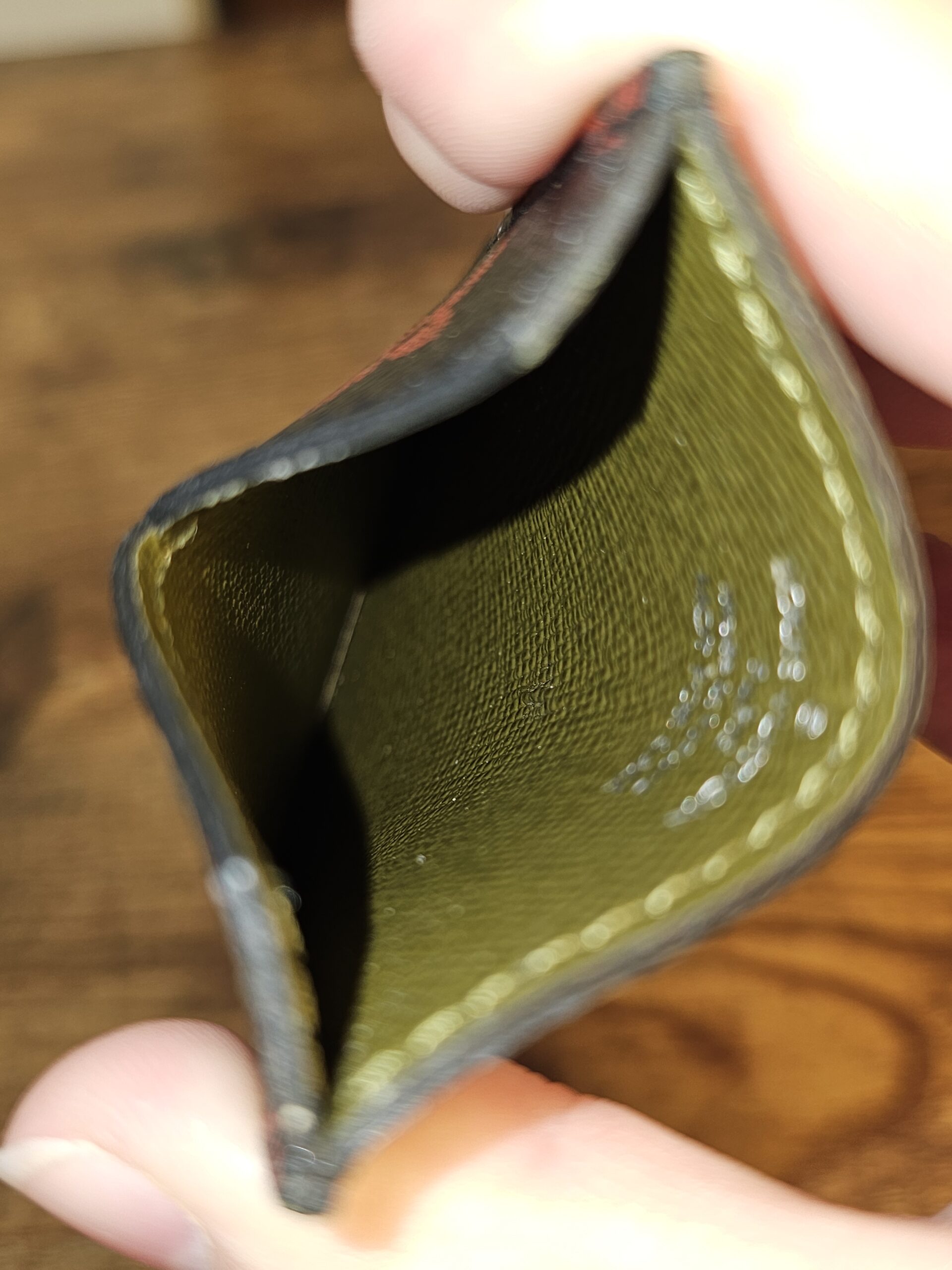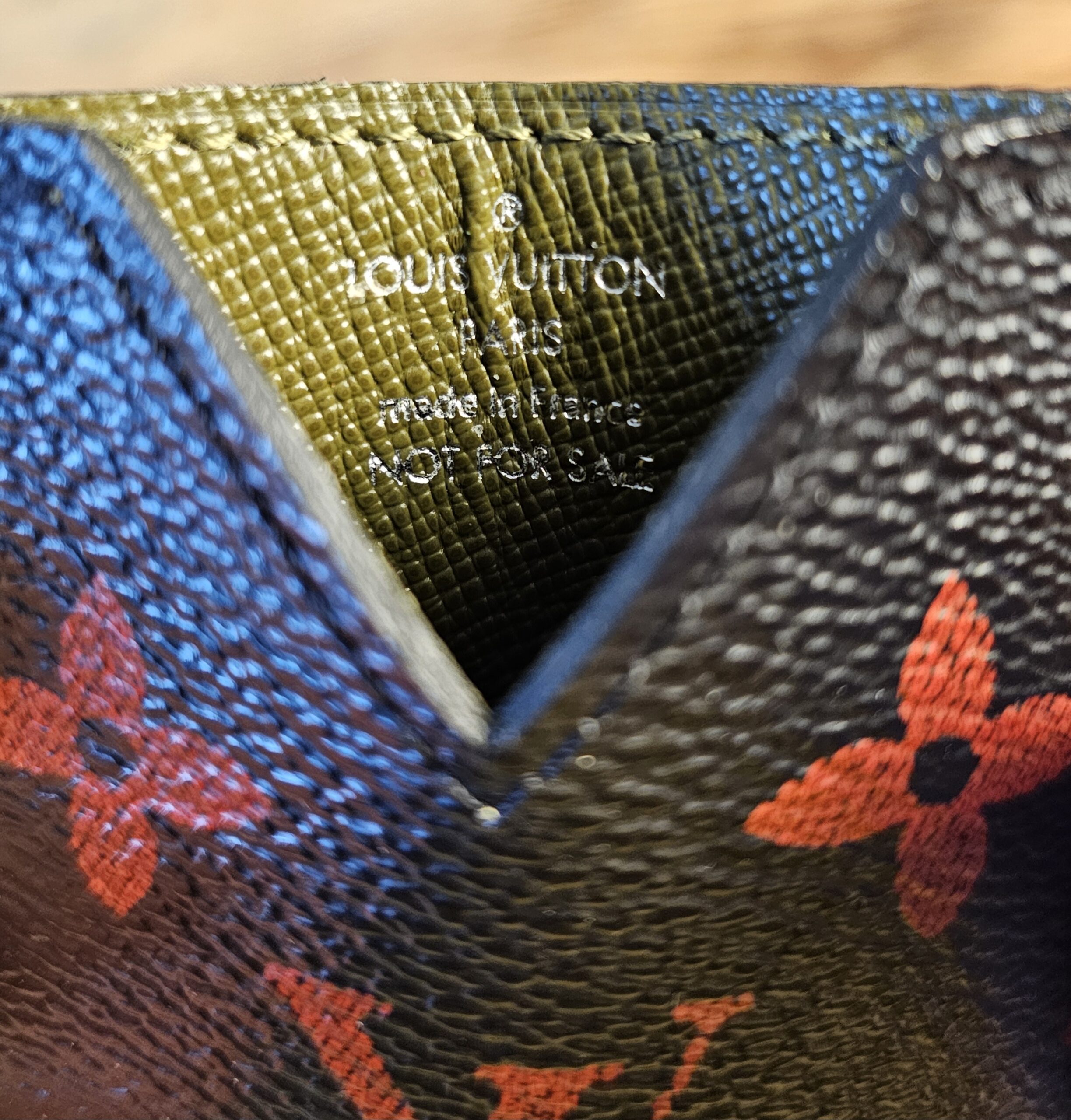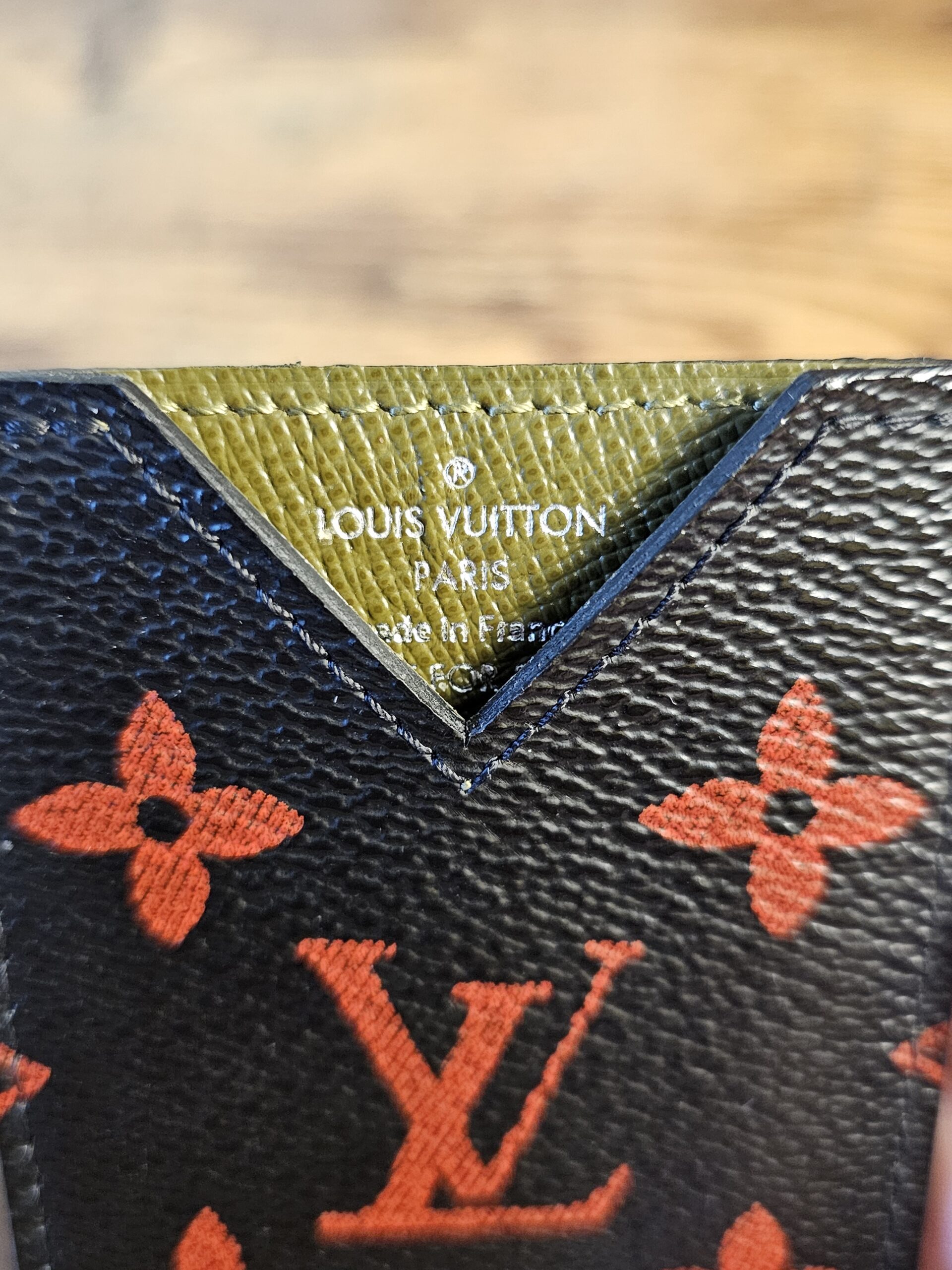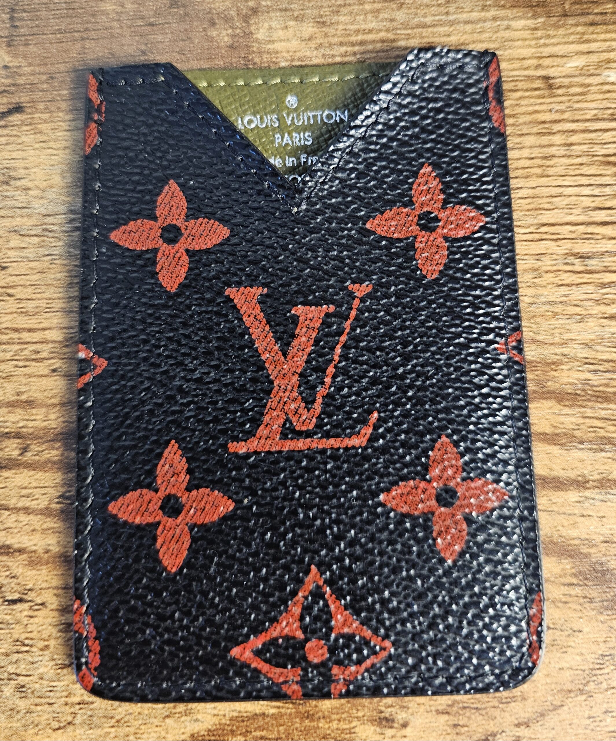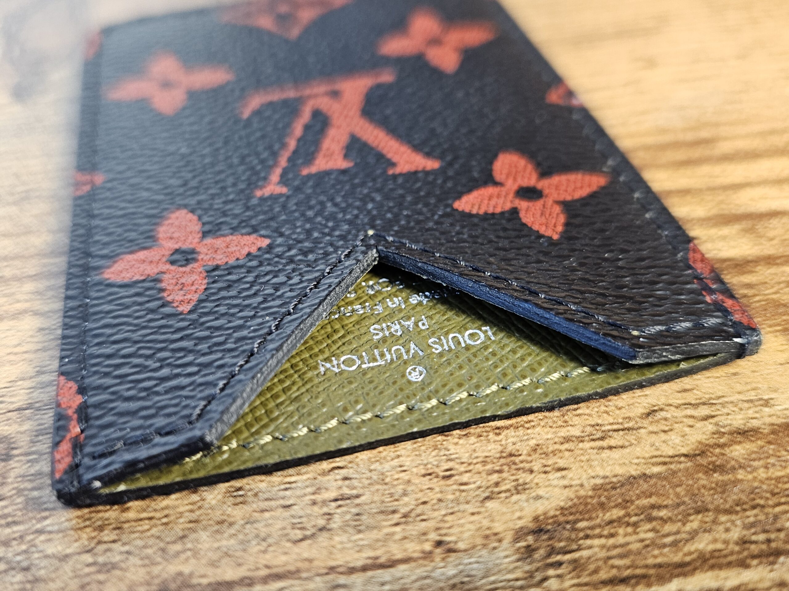 VIP Gift. Black and red monogram coated canvas nfrarouge cardholder with olive green leather lining and tonal stitching throughout.