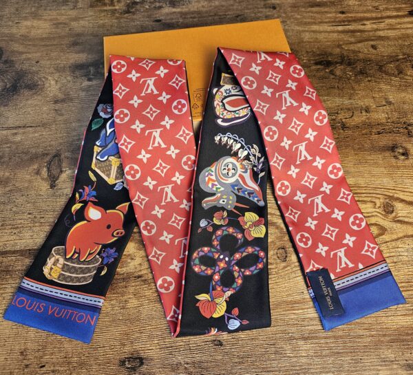 This bandeau features whimsical Chinese zodiac animals printed on a black background, with a red and white classic monogram print on the opposite side.